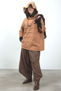カリンの木で染めた アーストーンのブラウスに、 茶のコットンパンツ。